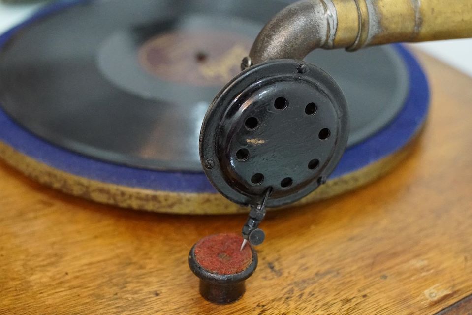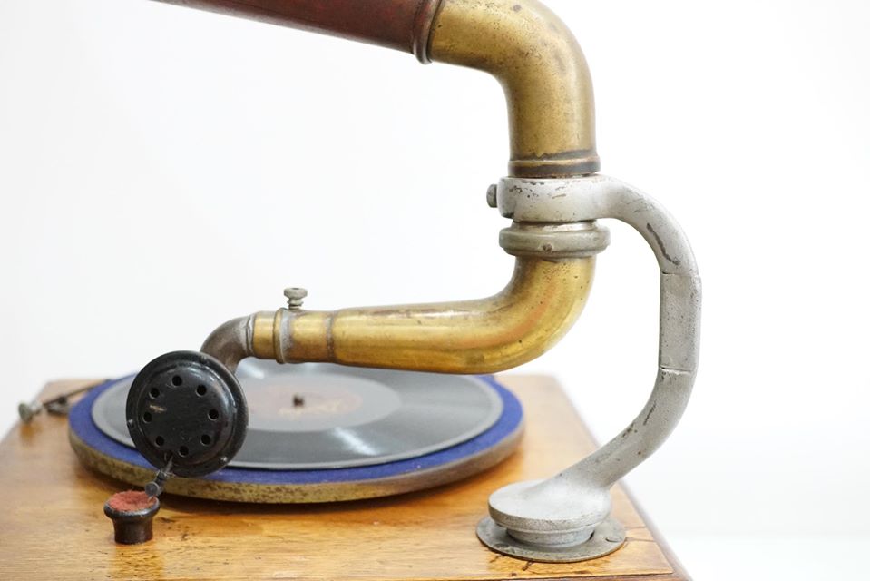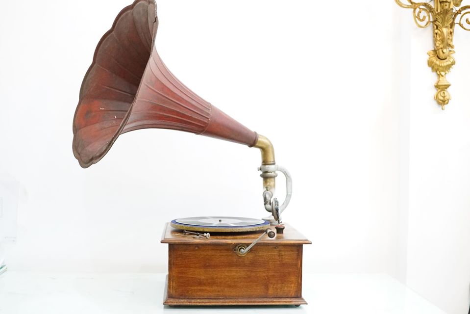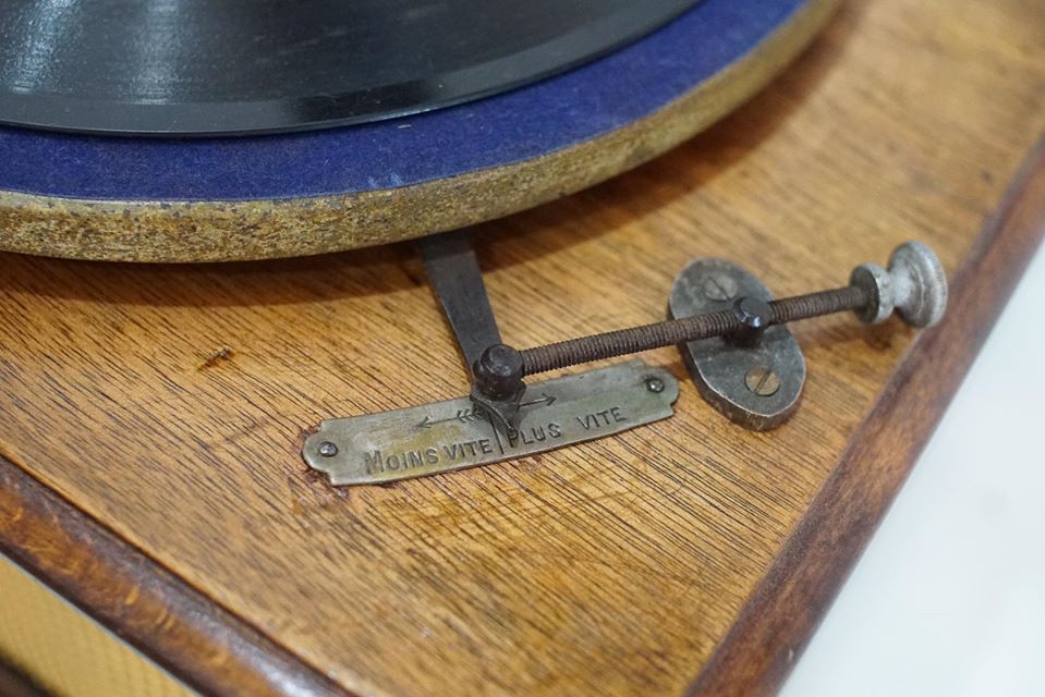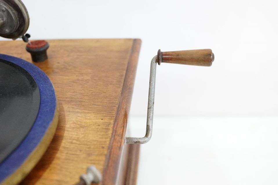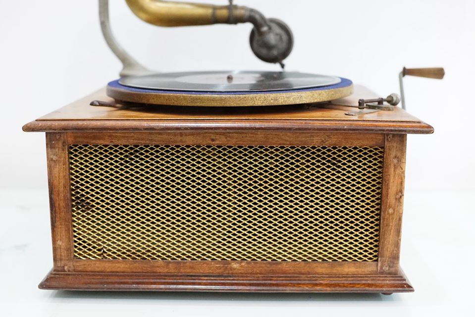 Máy chạy cót,tình trạng máy chạy rất êm và tốt,, toàn bộ thân máy, thùng bệ gỗ sồi, dáng cổ điển và mềm mại. Loa đã nhuốm màu thời gian,