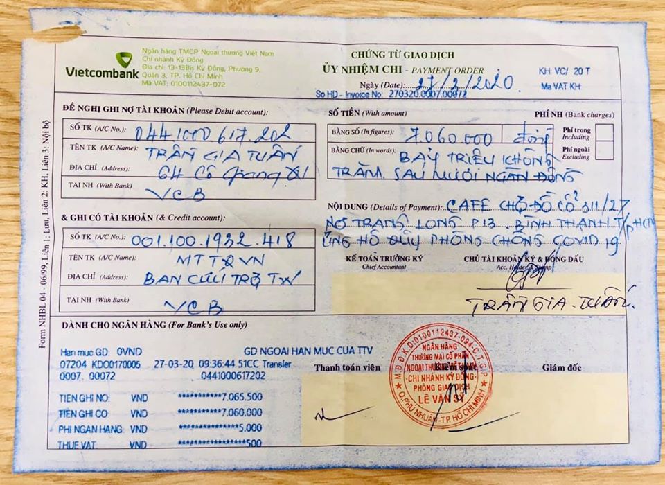 Nhân đây, chúng tôi cũng xin gửi lời cảm ơn chân thành đến tập thể anh, chị, em trong Hội, các Quý khách đã cùng chúng tôi chung tay tham gia đóng góp Quỹ phòng chống dịch Covid-19 vừa qua, với số tiền 7.060.000đ. Chúng tôi đã thực hiện việc chuyển sự đóng góp này đến Tài khoản của Mặt Trận TQVN - Ban Cứu trợ TW (ảnh đính kèm).